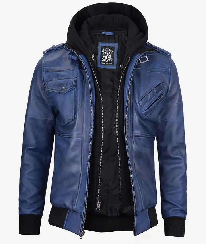 Men's Blue Wax Leather Jacket With Hood JNM-0017