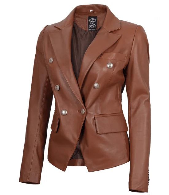 Introducing our stunning Double Breasted Cognac Leather Blazer for women. This blazer is beautifully crafted from 100% real lambskin leather, and cut to perfection with a Peak Lapel, double breasted buttons closure, and three outer pockets. The cognac color is simply gorgeous, and perfect for any season.