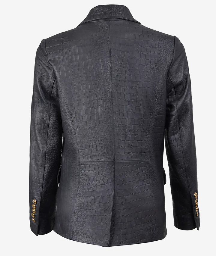 Step into luxury with our Textured Black Leather Blazer for women, designed with a sleek peak lapel and elegant two-button front. Perfect for transitioning effortlessly from office to evening, it's a must-have for the fashion-forward wardrobe.